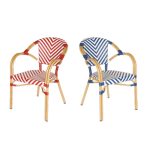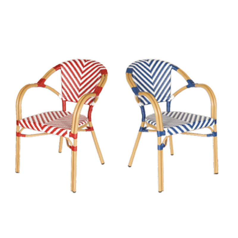 CHAISE STYLE BISTROT PARISIEN AVEC ACCOUDOIRS- Dimensions : 83 cm x 57 cm x 63 cm (H x L x P)- Matériel : Aluminium et rotin synthétique- Disponible en différents