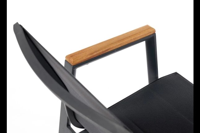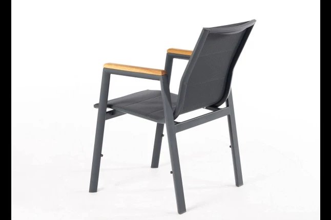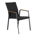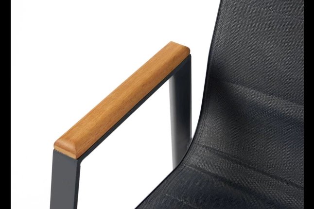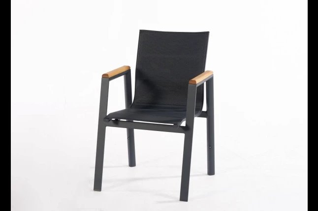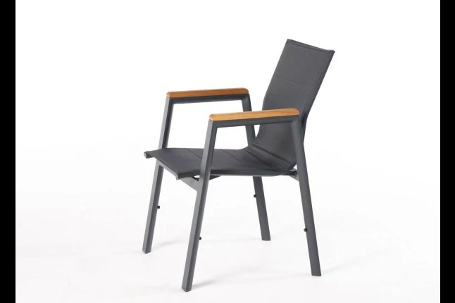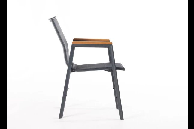 Chaise empilable avec accoudoirs avec armature en aluminium , assise. Et dossier et textilène luxe double. Accoudoir en teck . DISPONIBLE EN 4 COULEURS