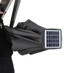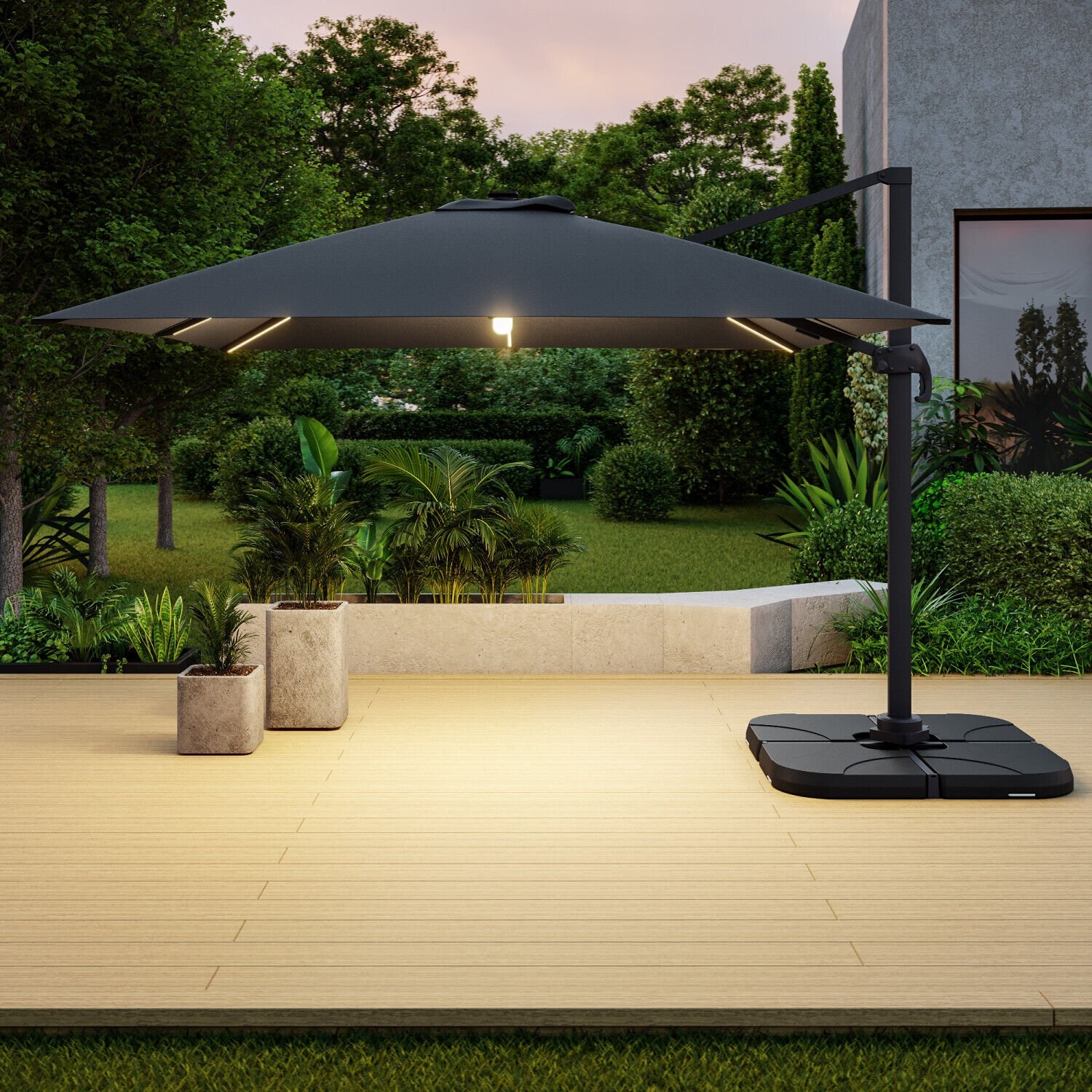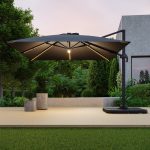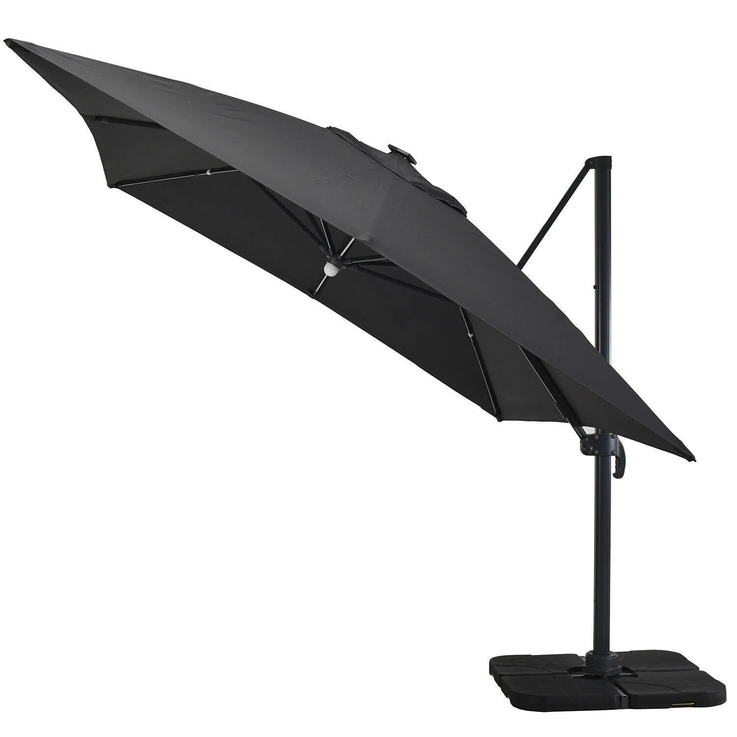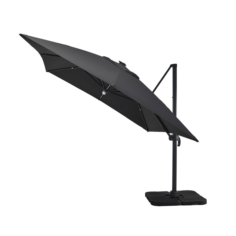 DESCRIPTIF PRODUIT Le parasol VELVET LED élégant et moderne, convient très bien aux moyens ou grands espaces. Accueillant et fonctionnel, il trouvera sa place sur votre terrasse ou dans votre jardin. Équipé d’un système d’éclairage à la fois économique et pratique (armatures et ampoule munies de LED), VELVET apporte la lumière nécessaire à vos soirées ou repas tardifs d’été. Fourni avec un panneau solaire et 3 batteries rechargeables. Le parasol haut de gamme VELVET est composé d’un mât ainsi que de 8 baleines en aluminium avec finition peinture thermolaquée, pour une plus grande protection contre l’oxydation. La toile de toit est très résistante aux intempéries (pluie, l’air salin) et aux rayons UV. Elle est en 100% polyester, avec une densité de 250g/m². Déporté, rotatif, inclinable et équipé d’une manivelle anti-retour et d’une poignée d’inclinaison, il est maniable et facile à orienter en fonction de la position du soleil. VELVET est également muni d’un auvent sur le sommet qui favorise la circulation de l’air et évite qu’il ne prenne le vent en cas de petite brise. Pour protéger et préserver votre parasol nous vous conseillons de le couvrir avec une housse de protection en cas de non utilisation. Les dalles nécessaires pour lester le parasol sont vendues séparément